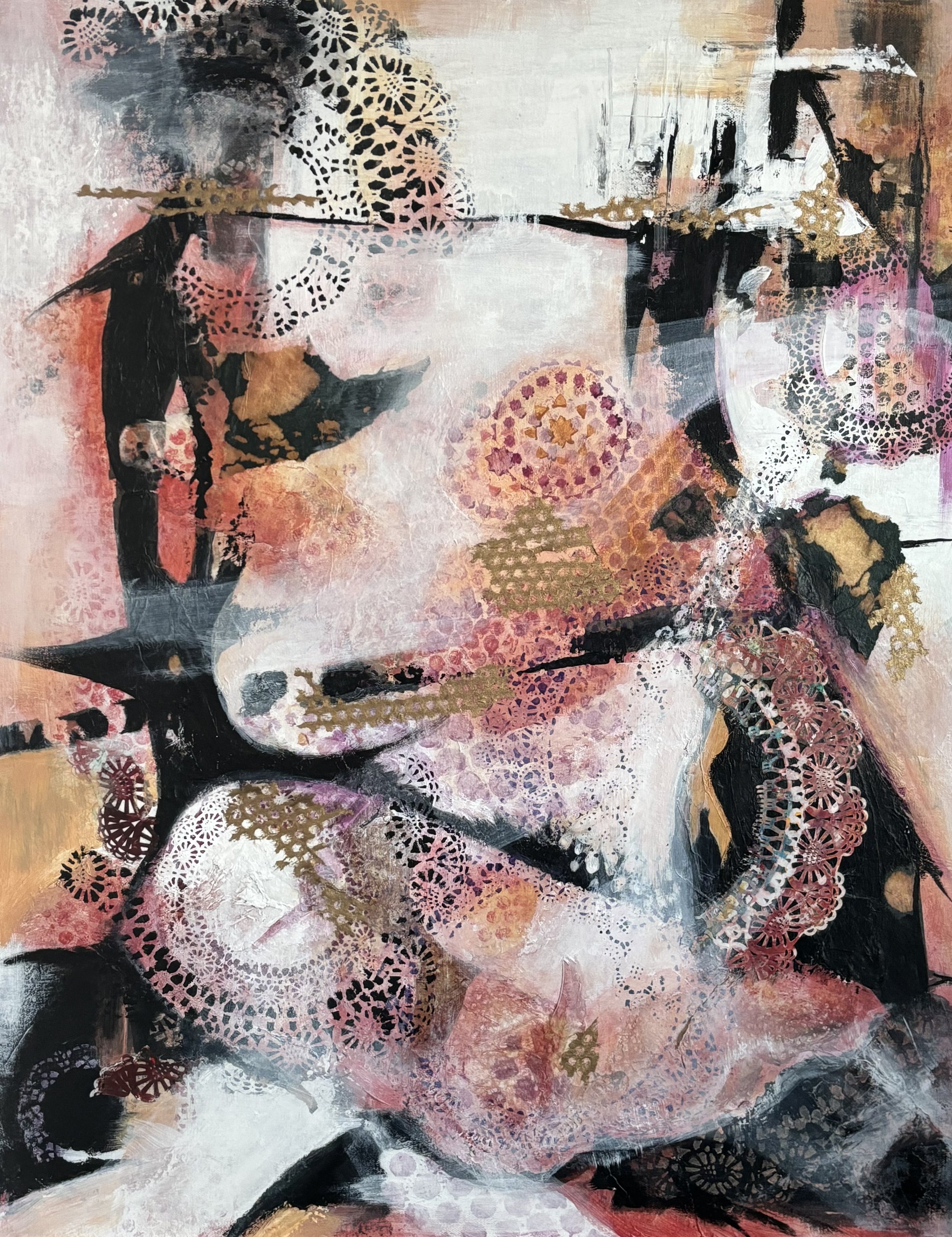Mixed media abstract in acrylic with collage elements which juxtapose sharp blacks with lacey doily-like layers in red, gold and white.